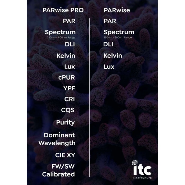 PARwise PRO has an even wider spectral range than the original, measuring down to 350nm upto 1100nm and features distinct calibrations for Air, Freshwater and Saltwater.