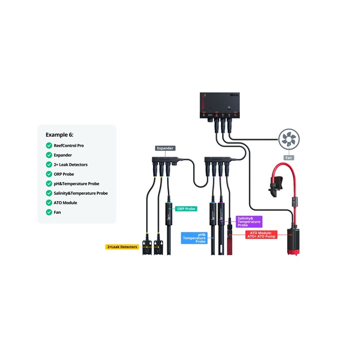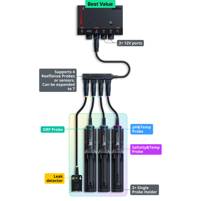 The ReefControl Pro - Comes with a pH & integrated Temperature Probe and a controller that can operate 4 Probes or Sensors, or 7 with the help of the ReefSense 4-Port Expander, plus two 12V DC add-on devices.