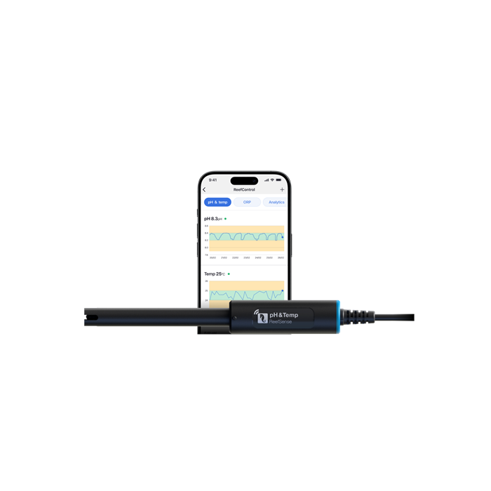 The ReefSense pH & Temperature probe can be connected to the ReefControl Lite or Pro controllers, providing real-time monitoring, notifications and logs.