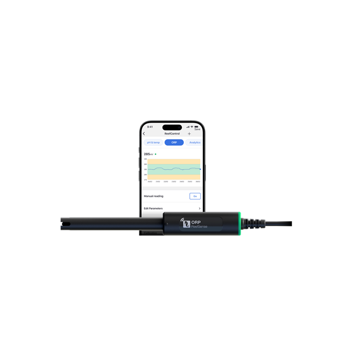 The digital ReefSense ORP probe can be connected to the ReefControl Lite or Pro controllers, providing real-time monitoring, notifications and logs.