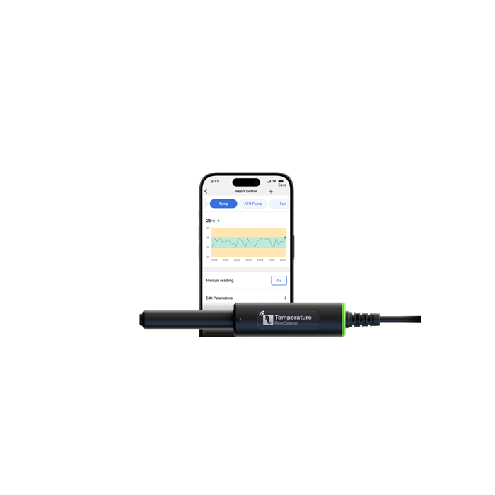 The titanium tipped ReefSense temperature probe can be connected directly to the ReefControl Power or to the ReefControl Lite or Pro controllers, providing real-time temperature monitoring, notifications and logs.