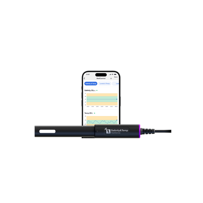 The ReefSense Salinity & Temperature probe can be connected to the ReefControl Lite or Pro controllers, providing real-time monitoring, notifications and logs.